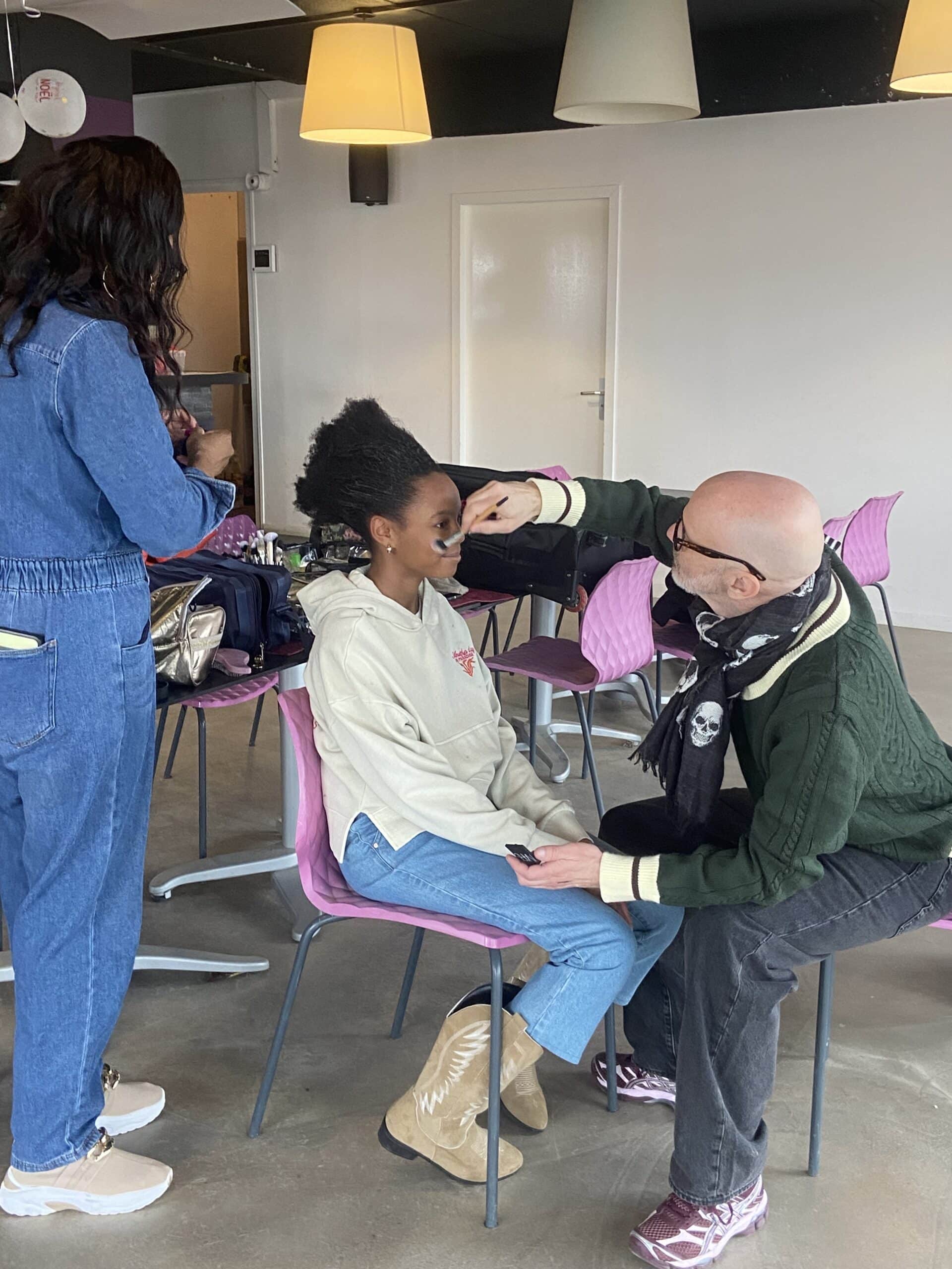 Ensuite, place à la coiffure ! Olivier, le coiffeur, sublime l’afro naturel de Kessy (avec un petit coup de main de sa maman !). Quelques coups de pinceaux à maquillage plus tard, notre mannequin est prête à poser dans le froid hivernal.