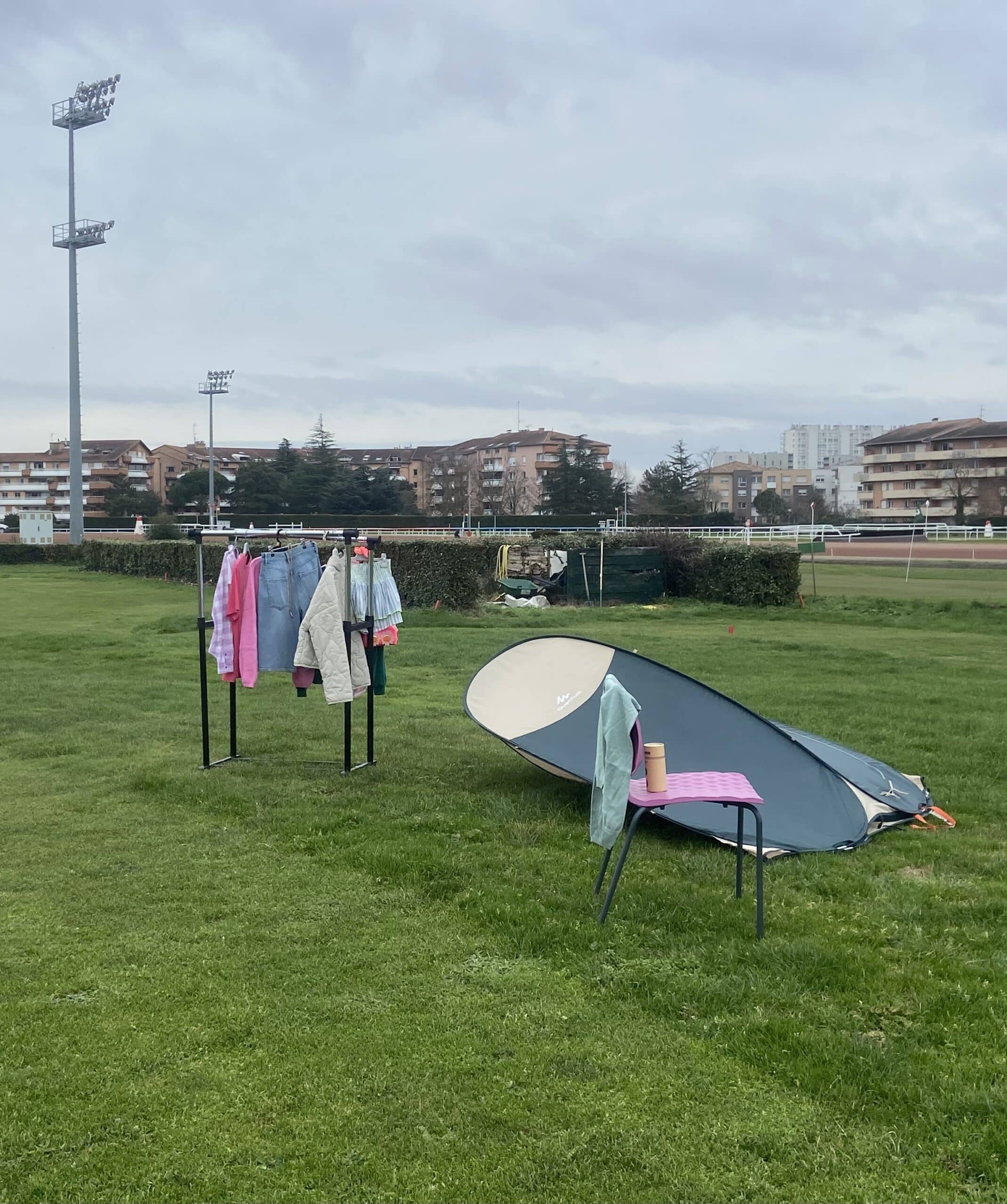Faire des allers-retours pour que Kessy puisse se changer en intérieur serait bien trop long, alors Louise a pensé à tout : une cabine et des portants directement sur place ! Attention au vent !