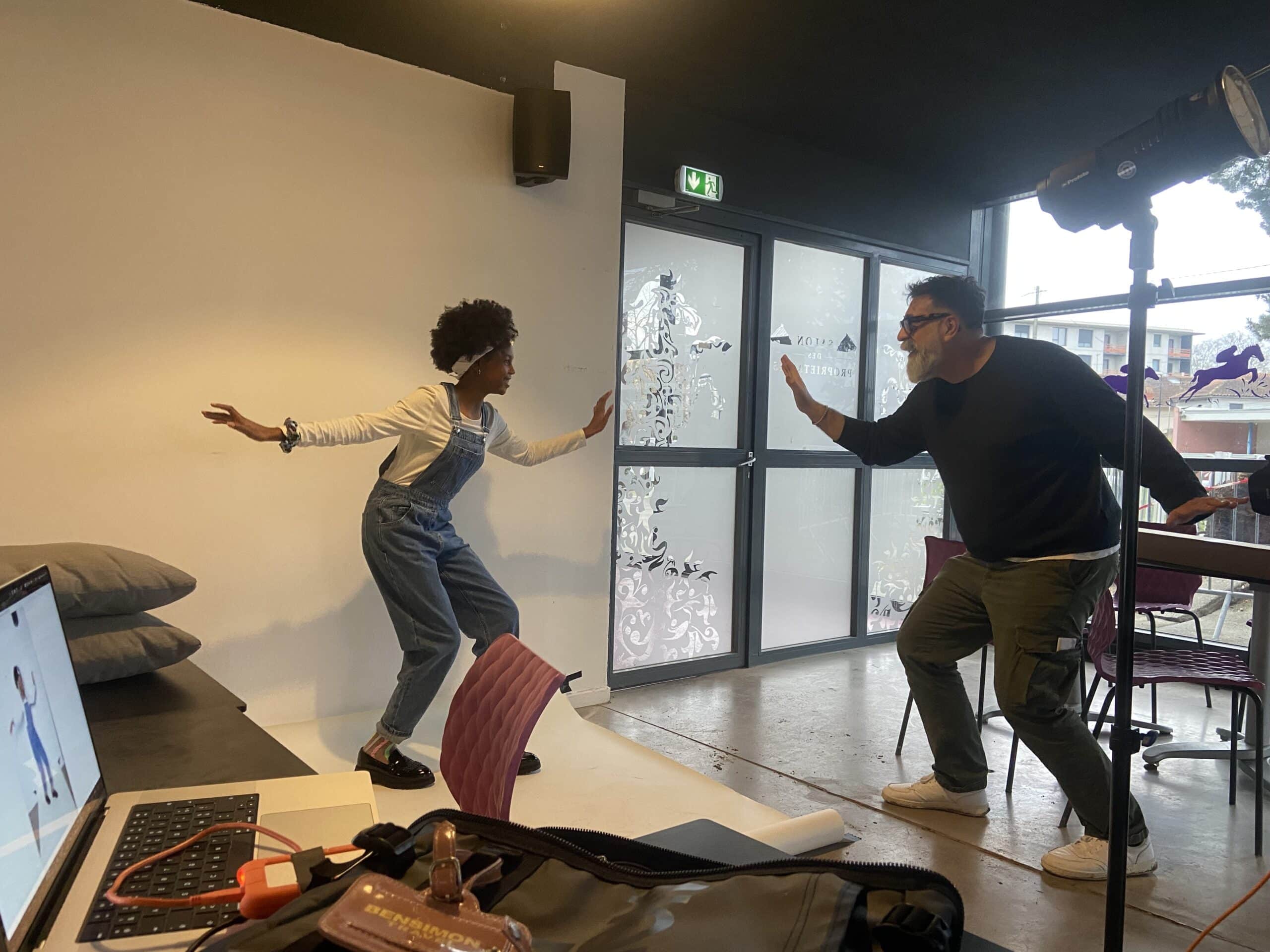 Enfin, retour en intérieur pour la photo de la page « test » de ton mag ! Vincent encourage Kessy, et Stéphane, le rédacteur graphiste, lui montre la pause.