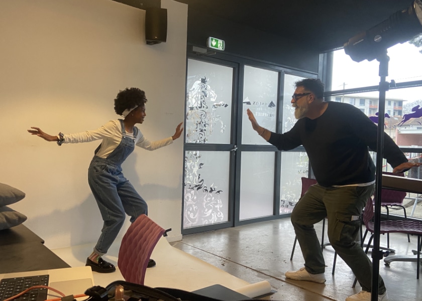Enfin, retour en intérieur pour la photo de la page « test » de ton mag ! Vincent encourage Kessy, et Stéphane, le rédacteur graphiste, lui montre la pause.