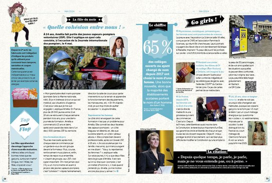 Chaque mois, le magazine s’empare d’un thème ou d’une de vos questions intimes : la peur de grandir, les règles, les métiers… Le dossier apporte des réponses complètes à toutes les interrogations des jeunes filles de 10 à 14 ans. Tous les moyens sont utilisés afin d’être le plus pertinent et le plus compréhensible possible : paroles d’expertes, schémas, BD… Le dossier permet d’envisager l’avenir avec optimisme.