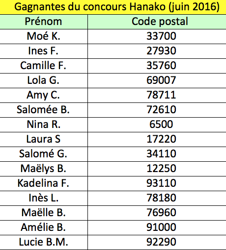 Voici les 15 gagnantes du concours Hanako organisé dans le Julie de juin. Elles recevront dans les semaines à venir un exemplaire d’ « Hanako, fille du soleil levant » dédicacé par l’auteur, Élodie, la modératrice du forum de Julie.